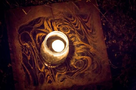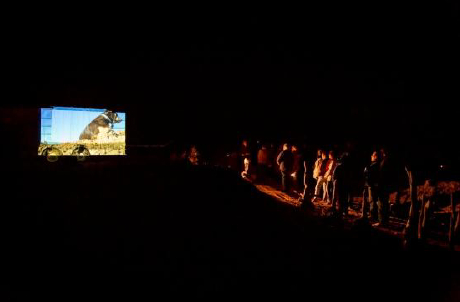 Trevor, with Marian & Rod bearing ‘survivor-style’ torches, led the group on a winding pathway past fire lit machinery “monsters” & a giant white field bin (which would later be used as a film projection screen.) We were invited to walk barefoot & silent to absorb the feel of the environment, & the specially created sound track of mood music.