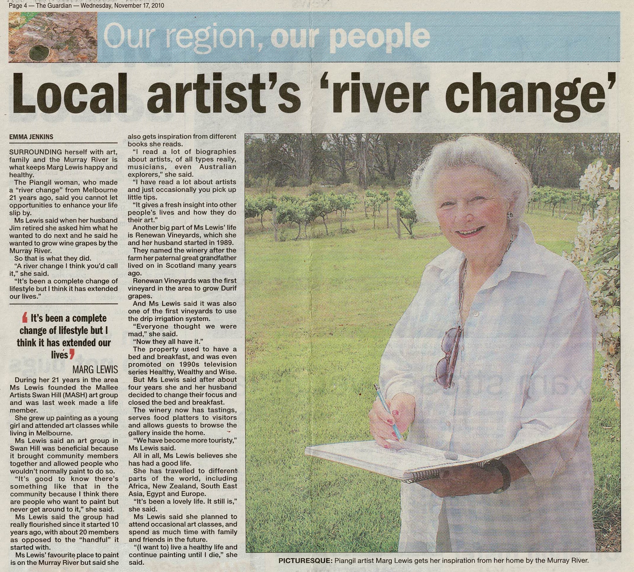 Marg Lewis proposed the creation of a local art group after providing art lessons and meeting some of the local artists. In 2001, a meeting was held at the Swan Hill Regional Art Gallery to discuss the idea and Mallee Artists Swan Hill (MASH) was launched, with Marg Lewis as inaugural President. In attendance with Marg were Helen Kaptein (Gallery Director) May Ward, Robyn Patterson, and Pauline Bennetto.