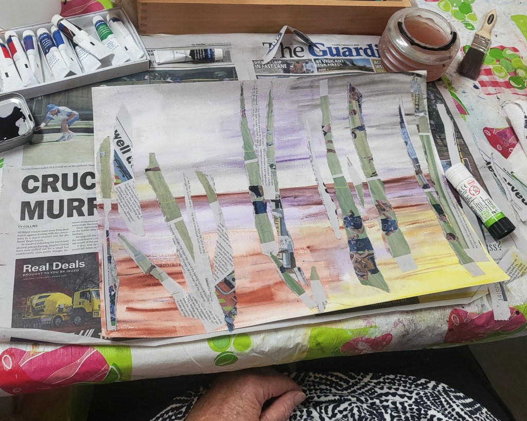 February: Mixed media (newspaper trees on painted background) with Maxine