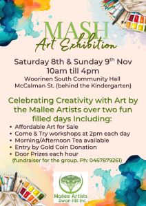 This will be held over two days.  Friday 10th & Saturday 11th May, 10am – 4pm at The Grain Shed, 2 King Street Swan Hill.  MASH members are invited to have a table to showcase and sell their art.